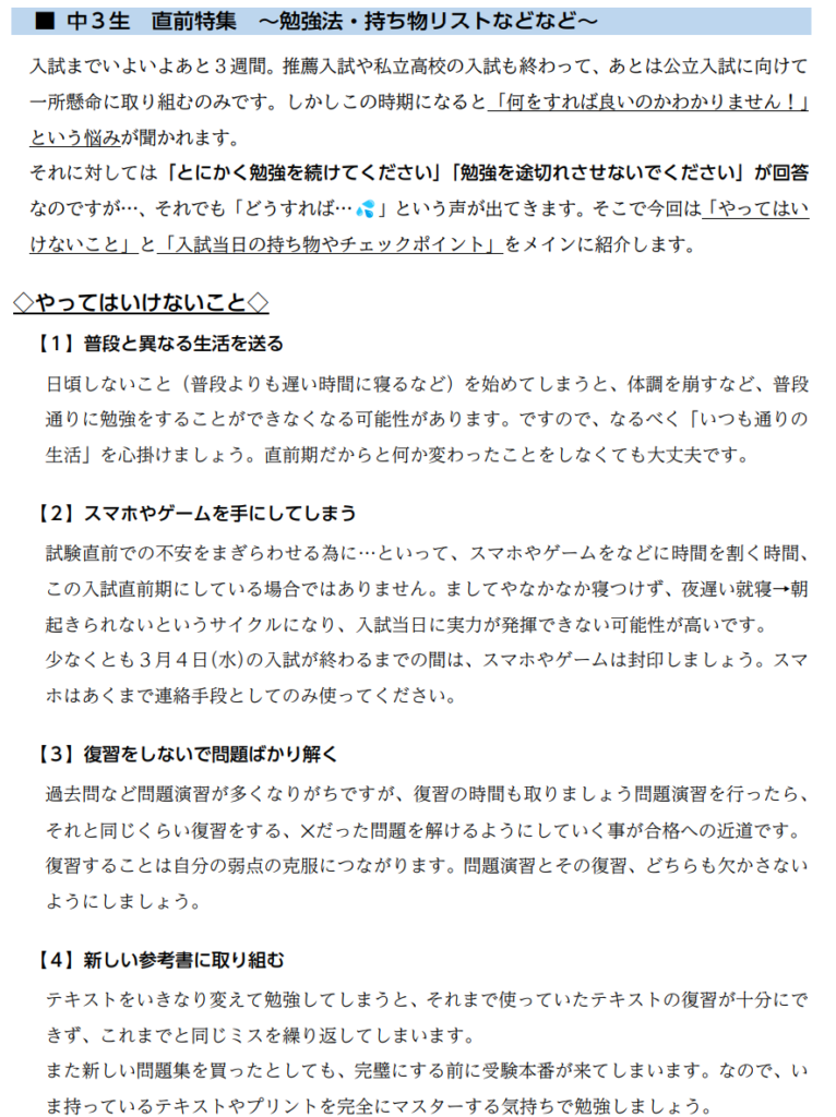 ・2月上旬~中旬…中1・中2学年末テスト対策授業