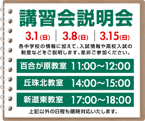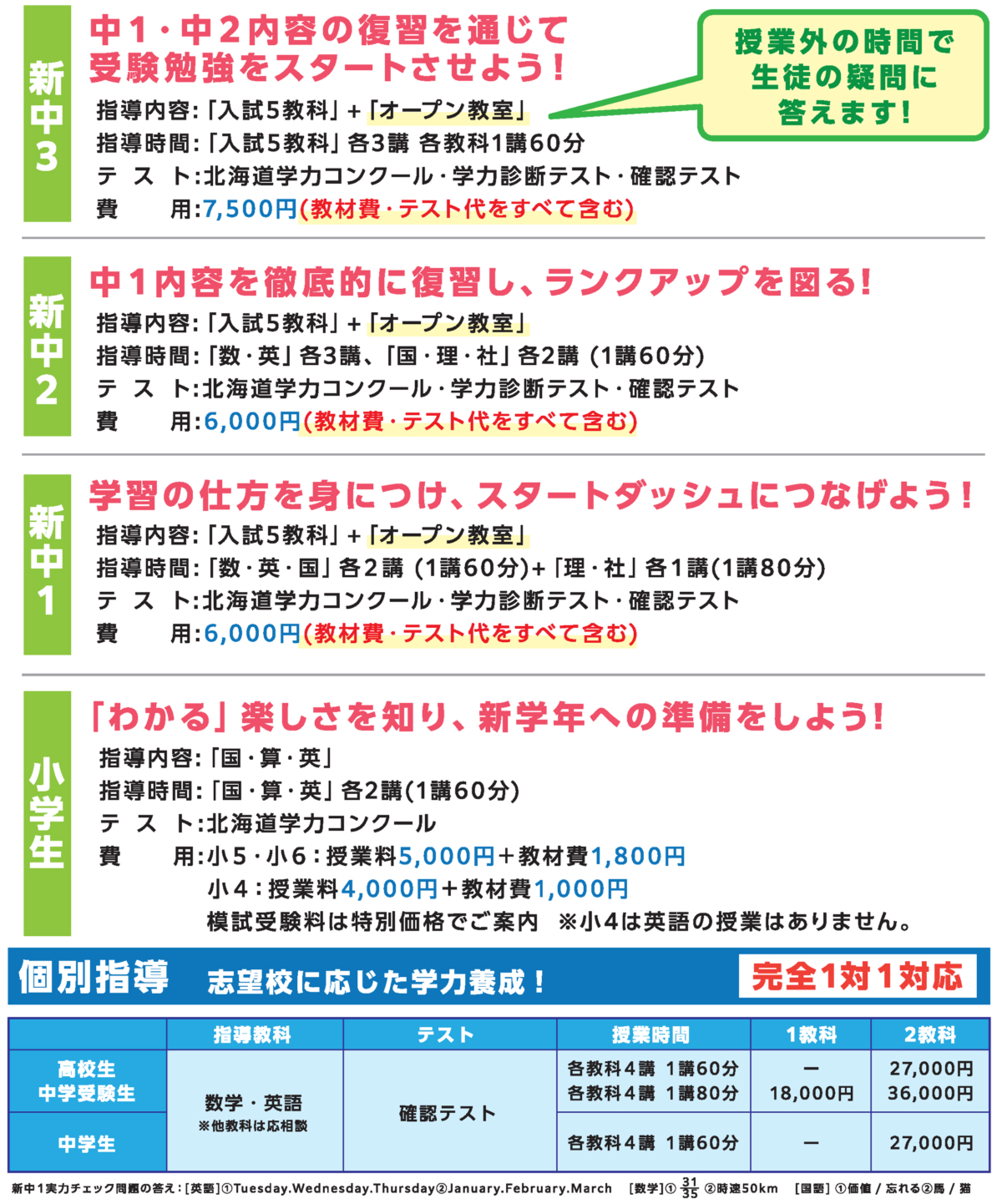 春期講習会に向けての体験授業とオープン教室を実施します。塾に対する不安を解消いただき、本格的な学習をいただくためのものです。